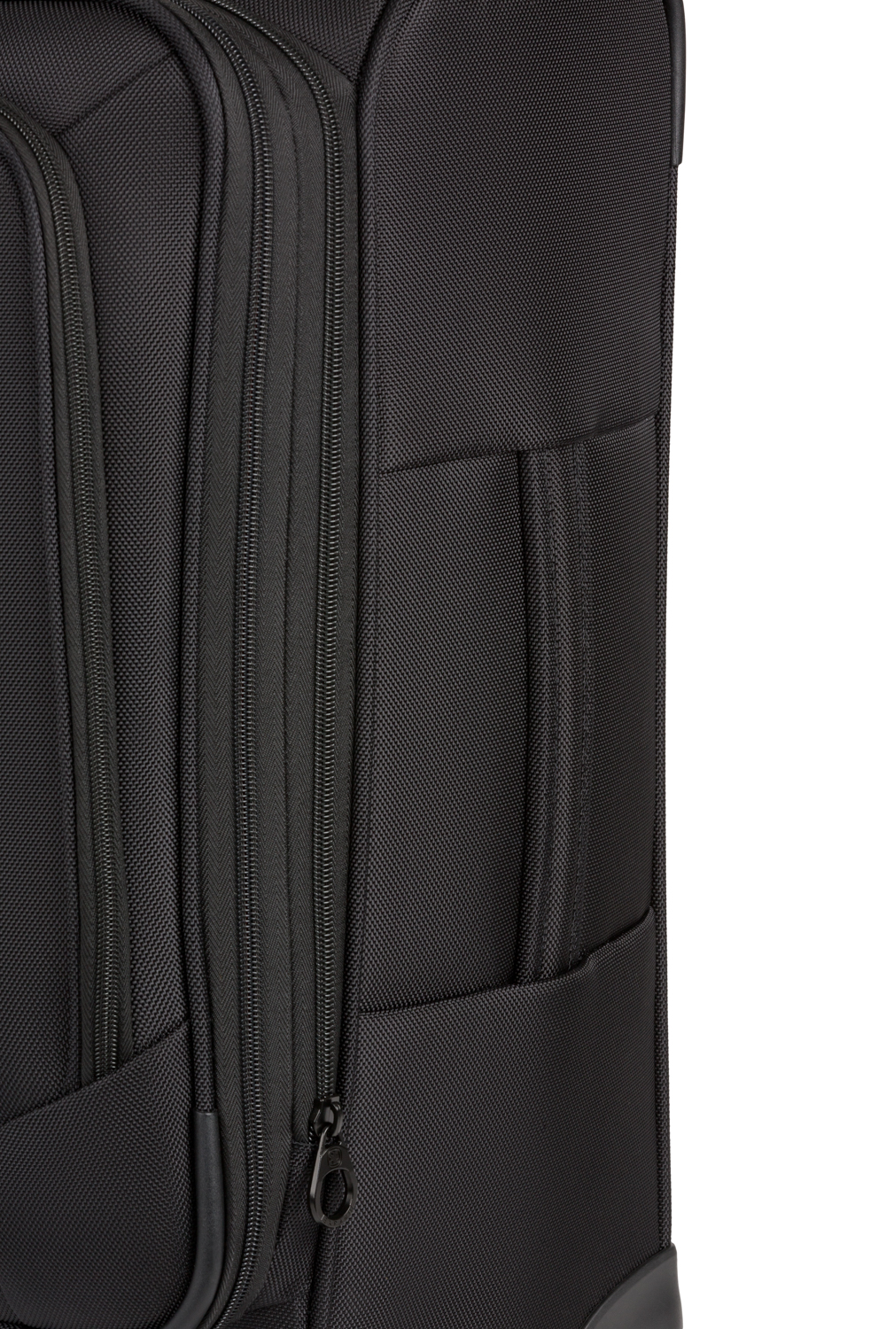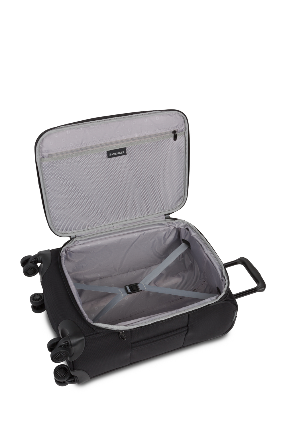 The exterior features a spacious zippered front pocket perfectly sized for files, catalogs, or even a sweater. Inside the suitcase, adjustable compression straps keep contents secure, while a zippered mesh flat pocket is ideal for undergarments, accessories, and other essentials.