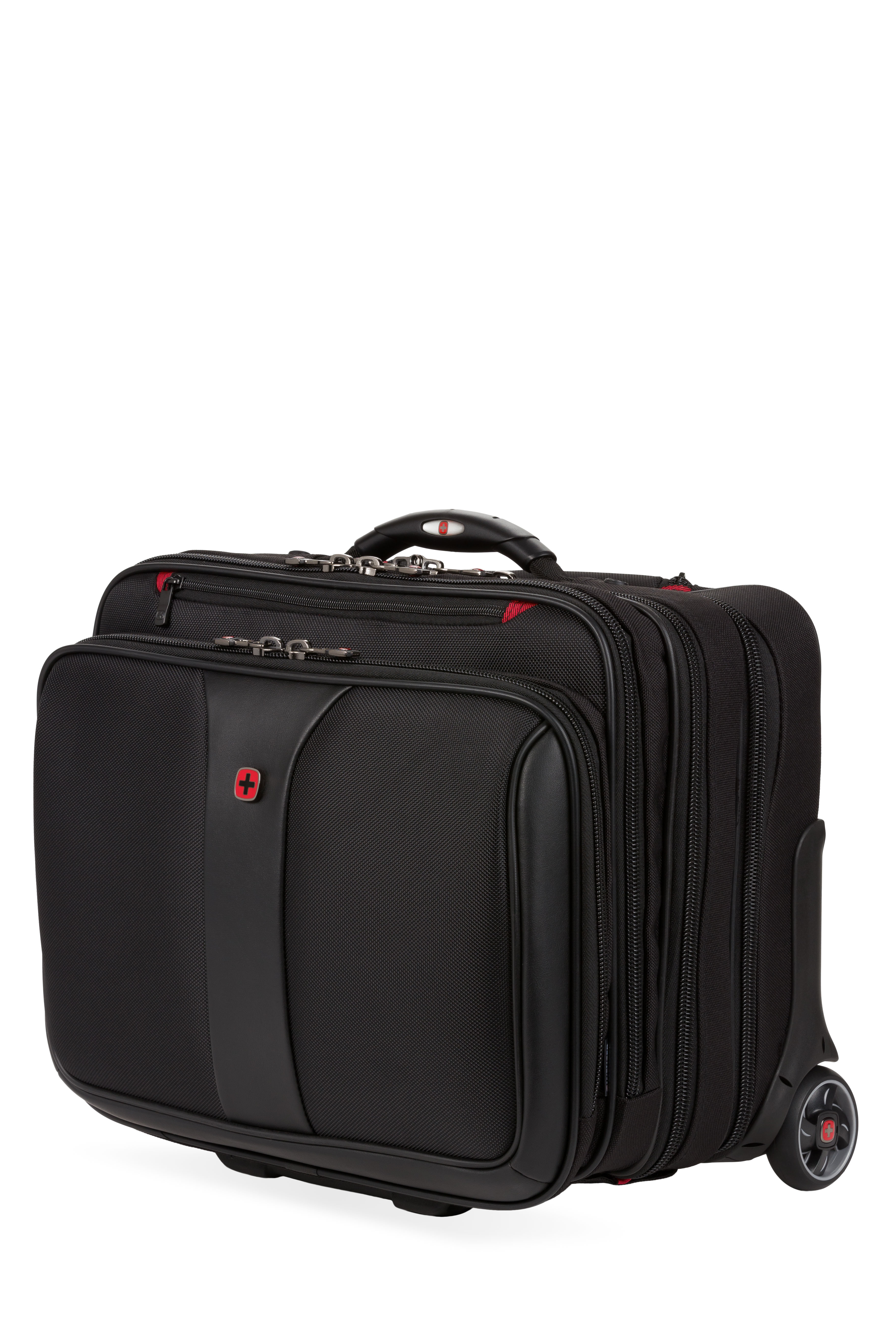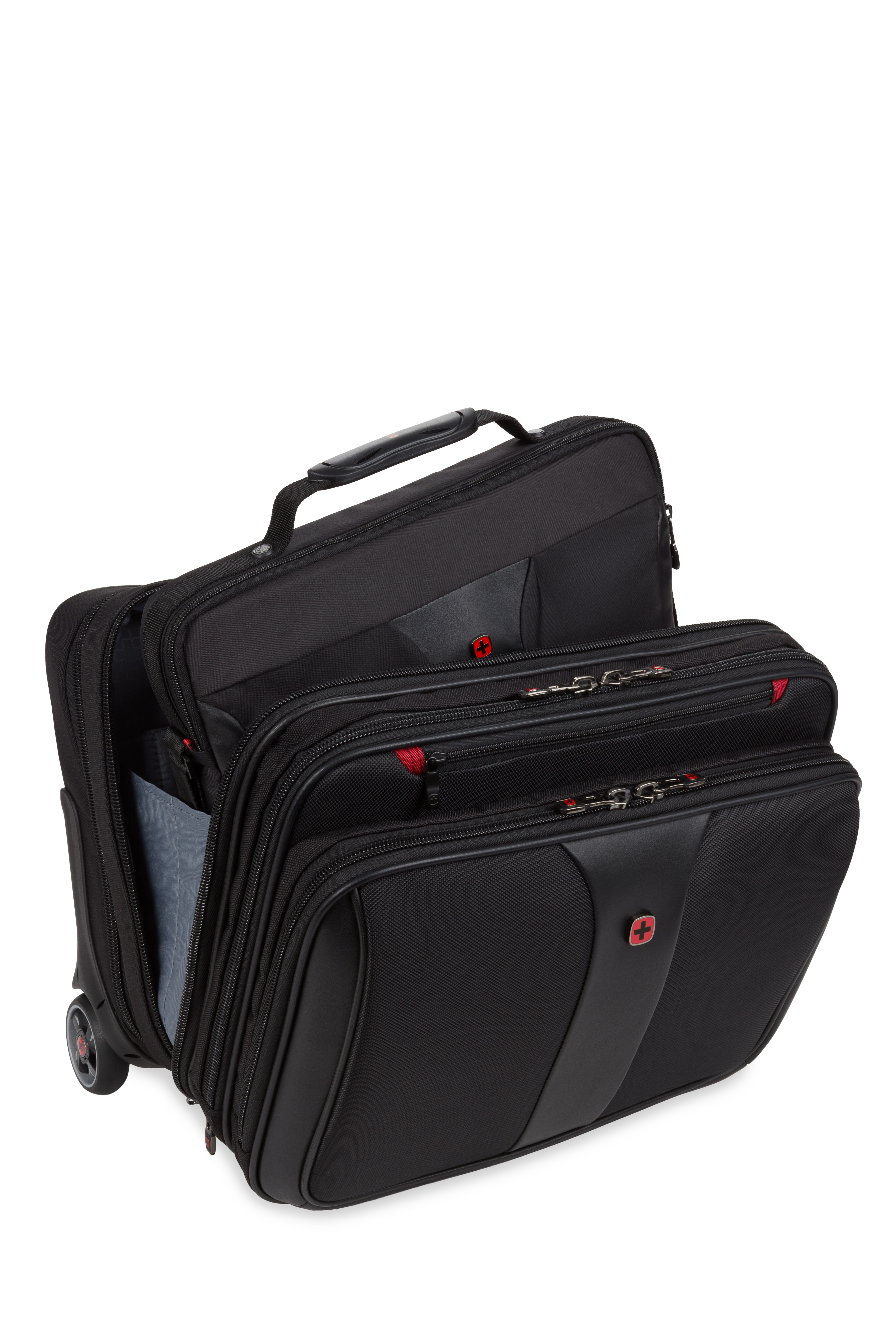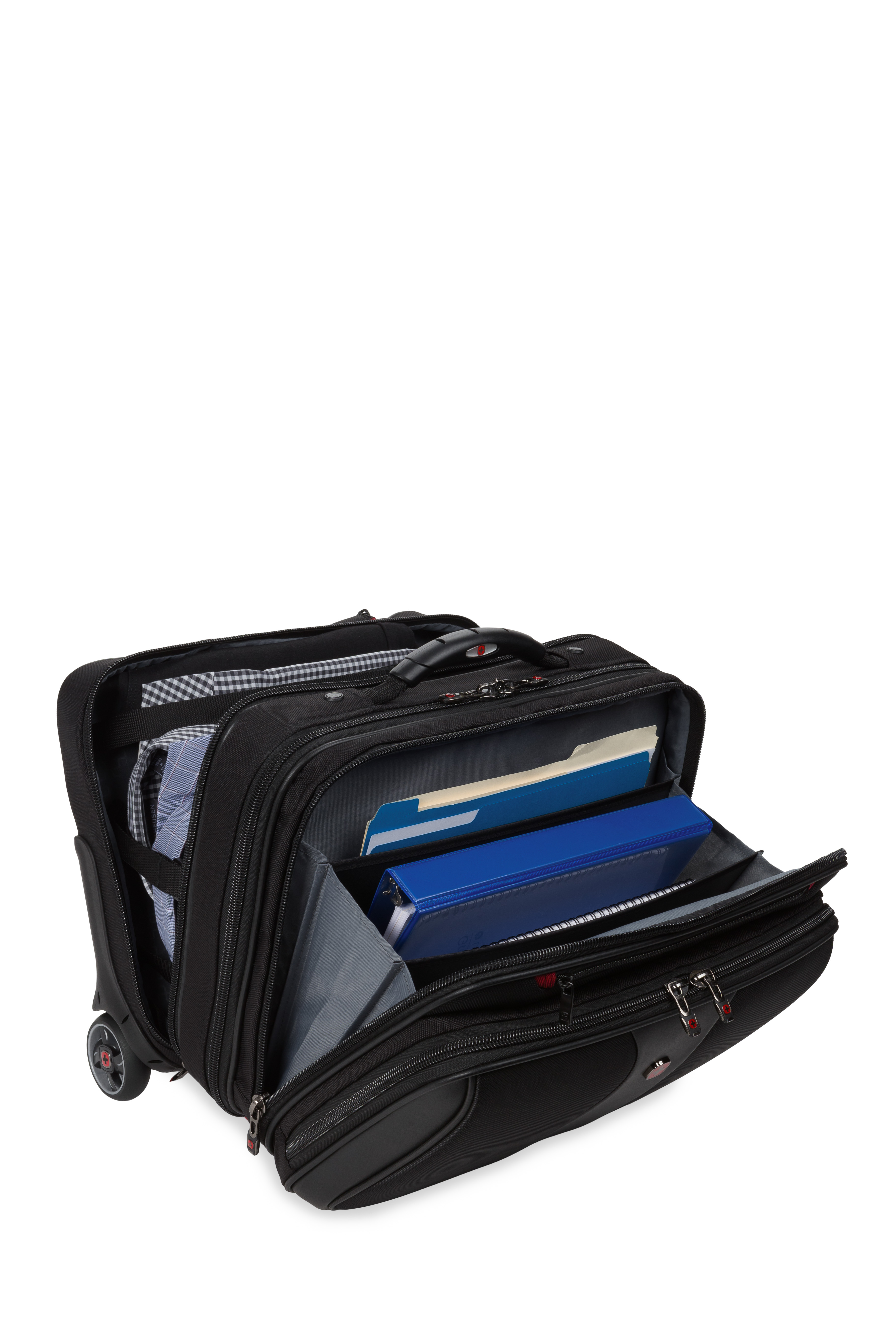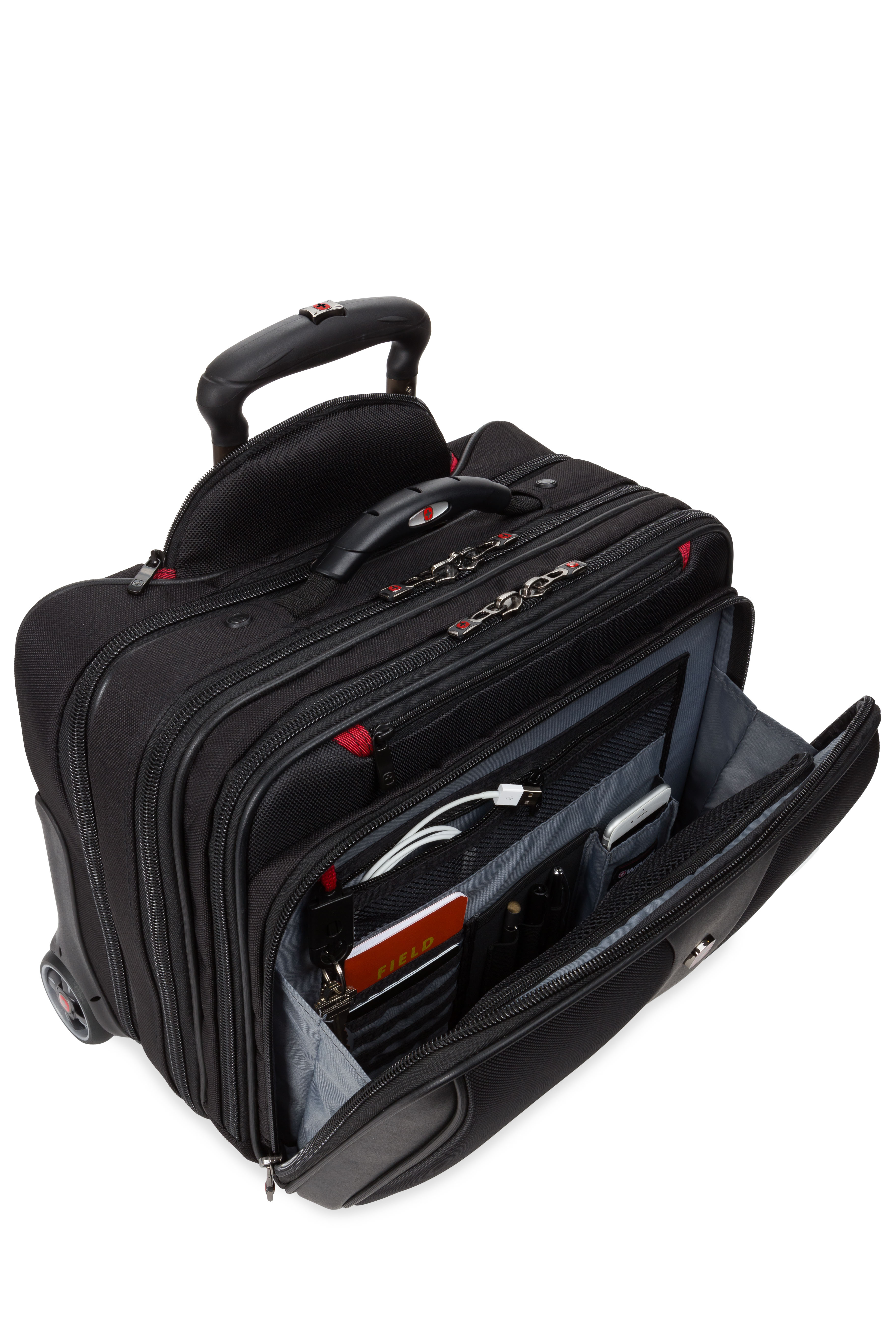 An essentials organizer keeps everyday gear neat, while the overnight compartment stores clothes. The expandable file divider and a quick pocket offer speedy access on the move. Featuring easy-glide wheels for smooth maneuvering and an ergonomic handle for optimum comfort.